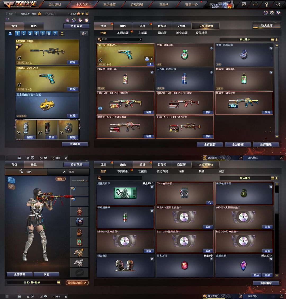 限制: 租号3次及以上 | 撤单率<50%才可租用此帐号装备描述:【装备道具】:【m200-幻神+幻神-ag17冠军+幻神-黄忠幻神皮肤+幻神音效卡+柯尔特-冠军之特】【qbz95-幻兽+幻兽手枪+女皇利刃-幻兽+幻兽手雷套】【qbz金色蔷薇/qbz-ag19冠军+柯尔特-竞技荣光】【scar-白虎+白虎-ag20冠军+hk417-朱雀+荣耀世冠-柯尔特】【cop-堕天神+麒麟刺-堕天神+堕天神手蕾套】【破空呛刃-夜魔+马来剑-夜魔+夜魔手蕾套】【黑骑士+黑骑士-冠军之势+黑骑士-ags4冠军典藏+黑骑士音效卡】【雷神+雷神-荣耀之魄+雷神-宠儿+雷神-传奇n9+雷神音效卡】【火麒麟+火麒麟-cfs2018+火麒麟音效卡】【毁灭+毁灭-荣耀之怒+毁灭音效卡】【黑龙+黑龙-暗月】【无影+无影-暗月】【天龙+天龙-传奇白鲨】【屠龙-荣耀之锋】【6烈龙+炼狱+死亡之眼】 王者炎心 王者之心 王者之幻 王者之戮 王者之魄 王者之势 王者之武 王者之力 王者之怒 王者之锋 王者之击 王者之啸 炫金超新星 炫金黑龙 炫金毁灭【小人呛】 火麒麟-绝迹 【角色】 4防王者葵-貂蝉 蝴蝶 葵 零 樱 王者涂鸦★佣兵觉醒★捕食者之眼★看血不换弹★