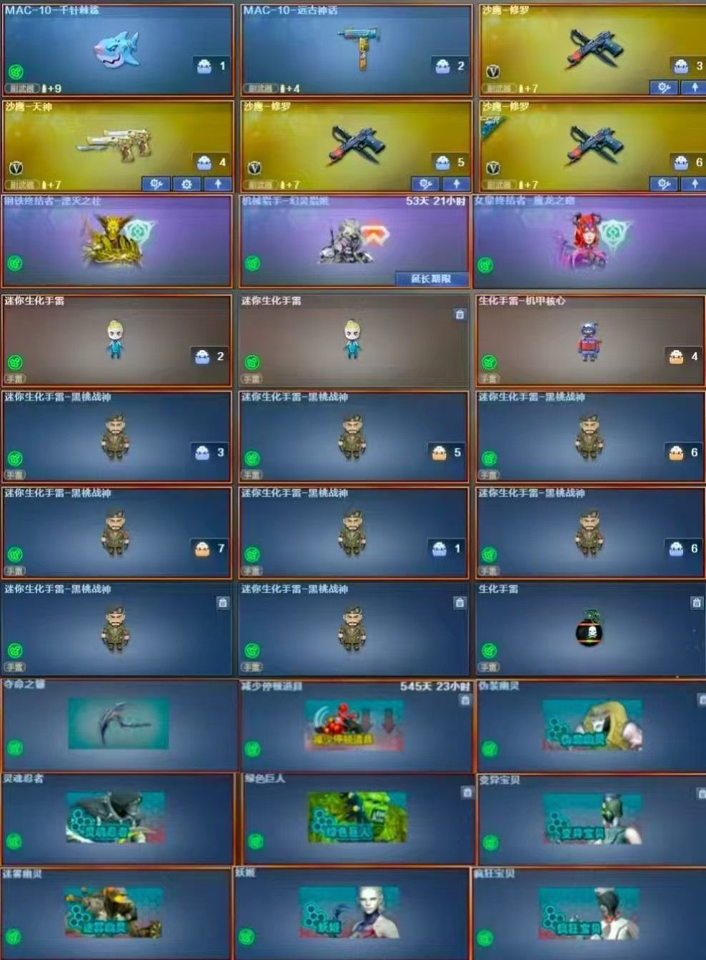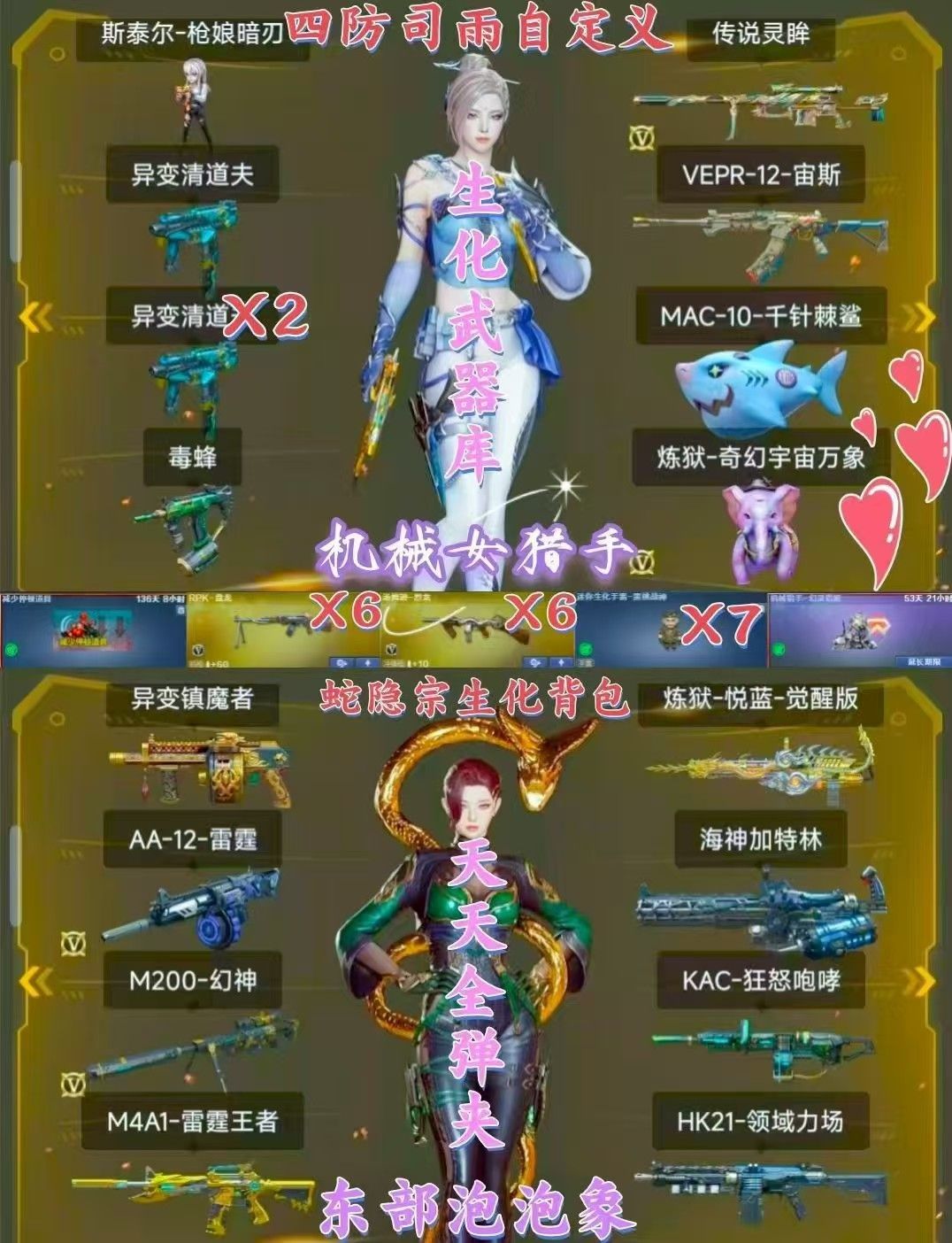 炼狱-泡泡象鲨鱼MAC+枪娘双清道夫毒蜂+生化6盘6烈+四防司雨蛇隐宗生化背包+宙斯喷机械女猎手幻神