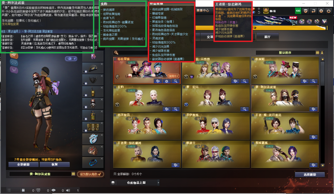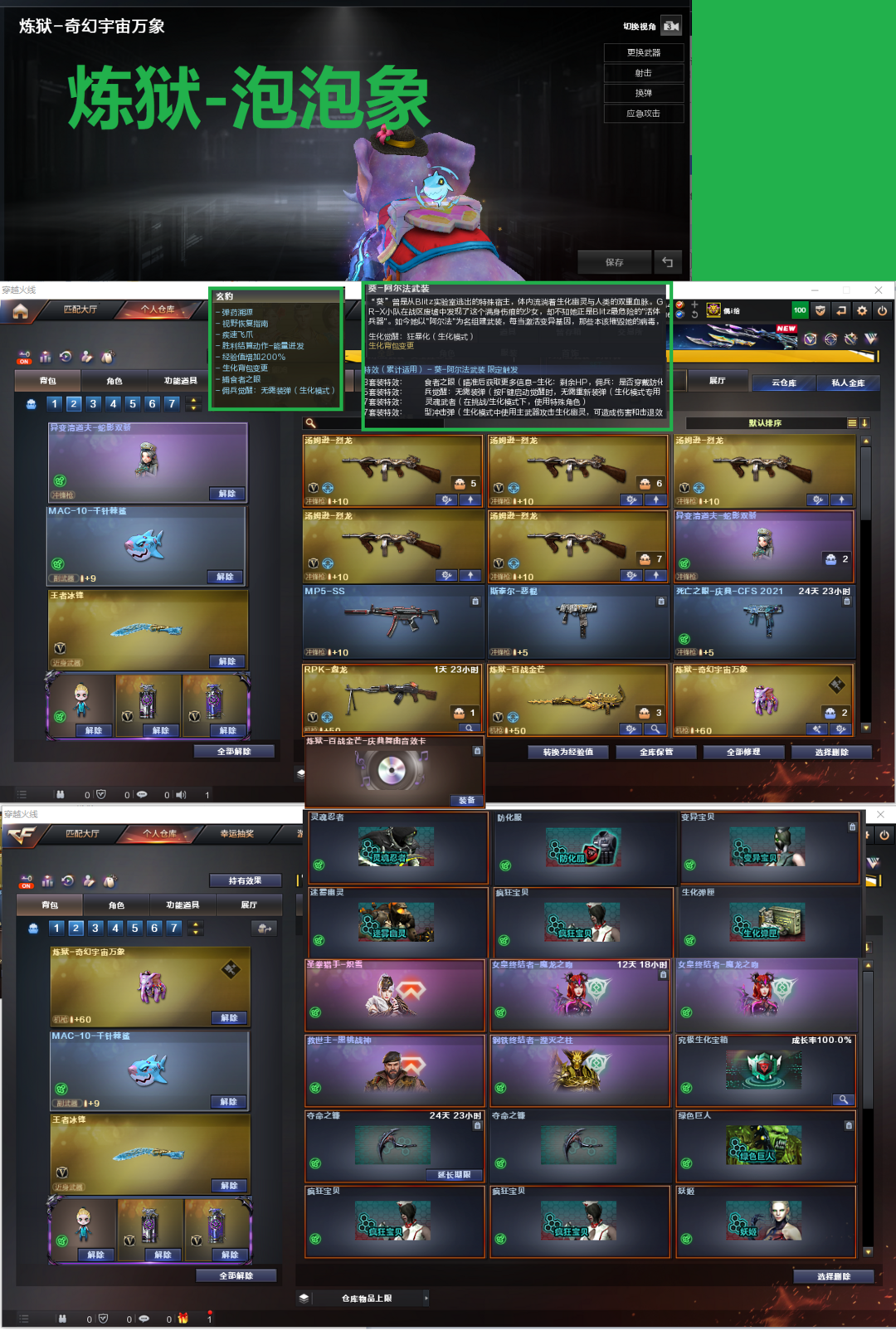 装备描述:排位:可以、、、、、、生化全装(生化模式换背包、可以查看生化僵尸血量):无需换弹、5烈、炼狱、炼狱-奇幻宇宙万象、异变清道夫-小人枪、MAC-10千针棘鲨、手斧镜、生化减速雷、超级对讲机、、、、、、爆破四防:幻神竞技荣光、USP雷暴、柯尔特竞技荣光、传说圣谕、FAMAS G2-天戎、白虎玄豹、QBZ金色蔷薇、、、裁决音效、天罚音效、、、3套雷暴、2套竞技荣光、1套玄豹、、、生化人物(葵-阿尔法武装、玄豹)爆破四防(传说星骇、云悠悠、机械姬、王者惊若翩鸿)