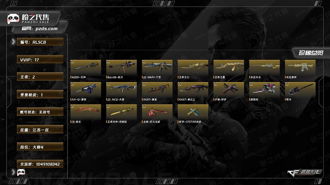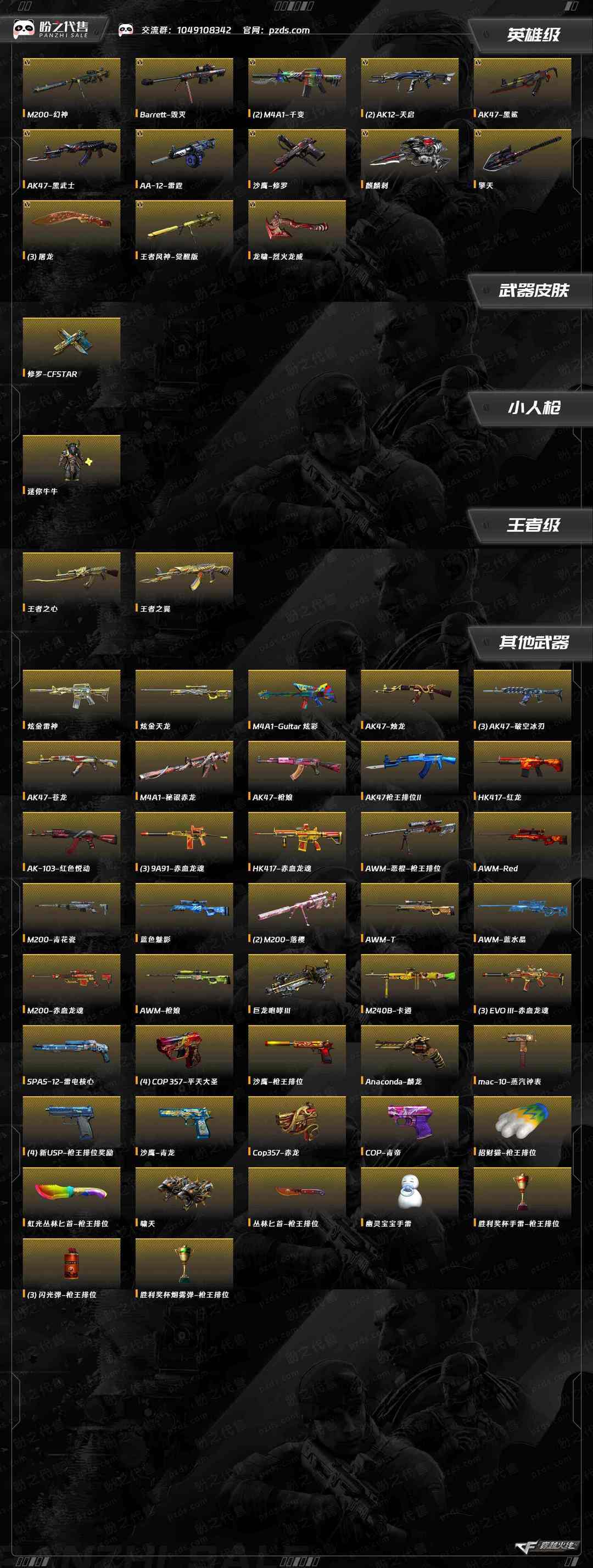 装备描述:王者武器:炫金雷神;炫金天龙;王者之心;王者之翼 英雄武器:M200-幻神;龙啸-烈火龙威;沙鹰-修罗;麒麟刺;AK47-黑武士;M4A1-千变;AK12-天启;AA-12-雷霆;AK47-黑鲨;擎天;Barrett-毁灭;屠龙 角色:雷霆-β;复仇者;威锋;灵狐者;影武者;影武者-X;雷豹;夜玫瑰-X;新曼陀罗;剑齿虎-X;圣诞潘多拉-X;风暴女;金戈;铁骑 道具:防弹头盔;C4工具钳;手雷包;防弹衣;夺命之镰;防化服;小兔皮;大圣头盔