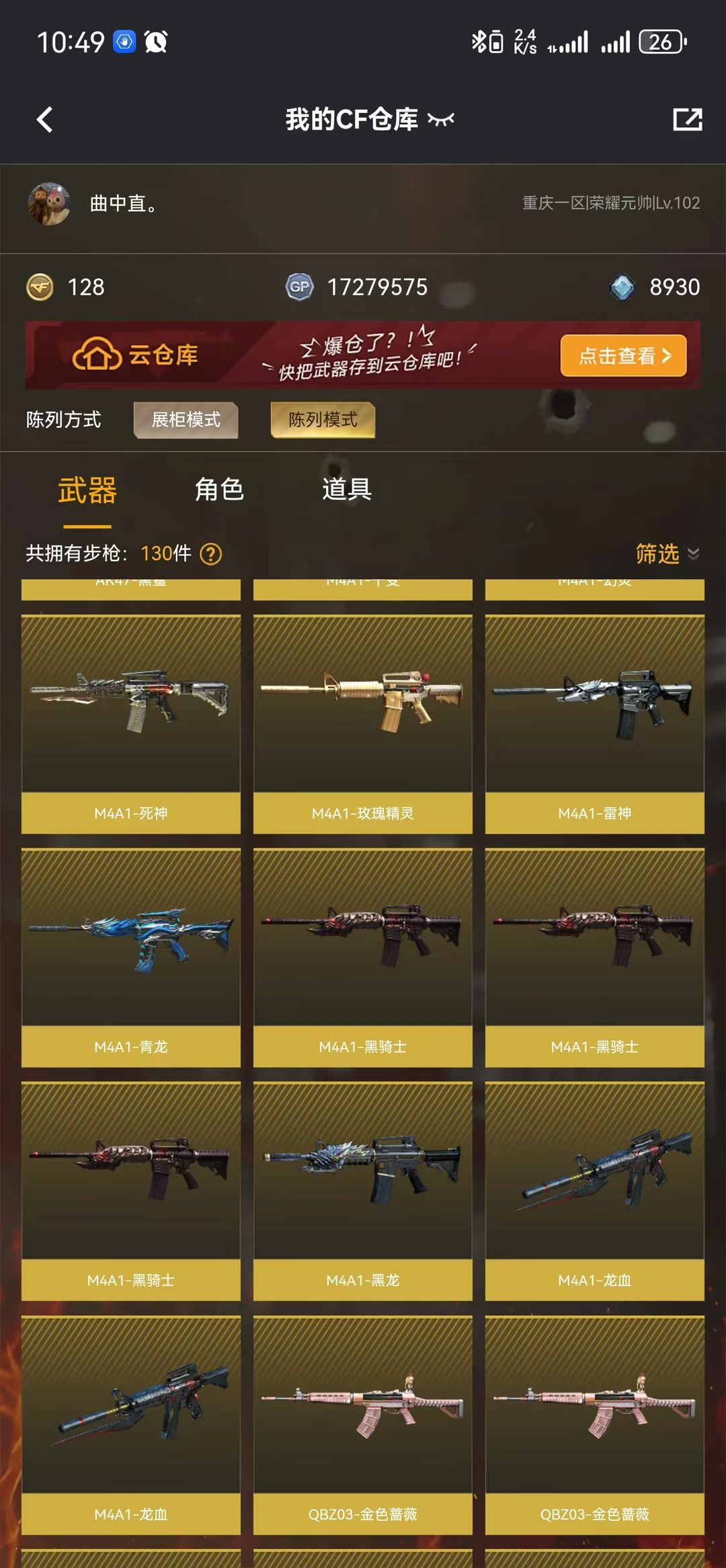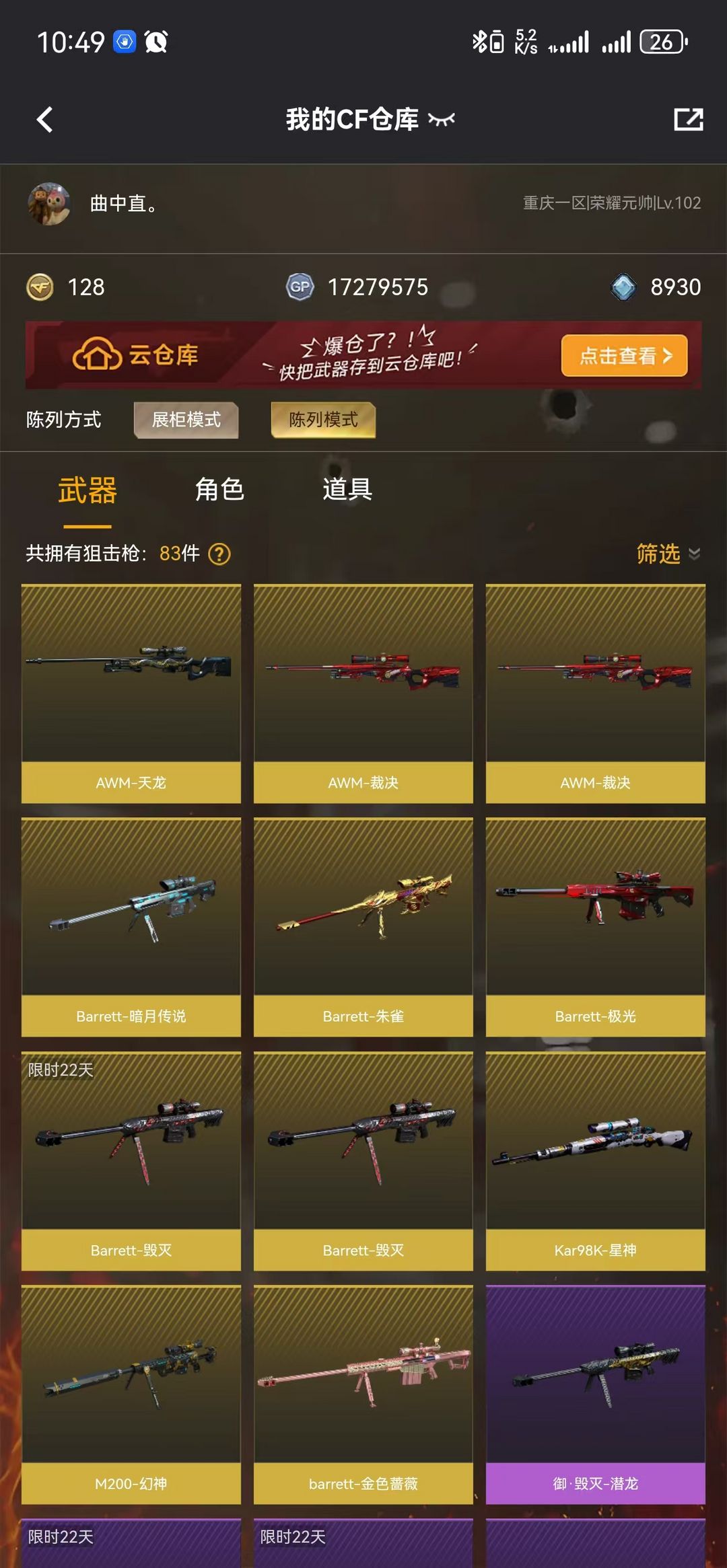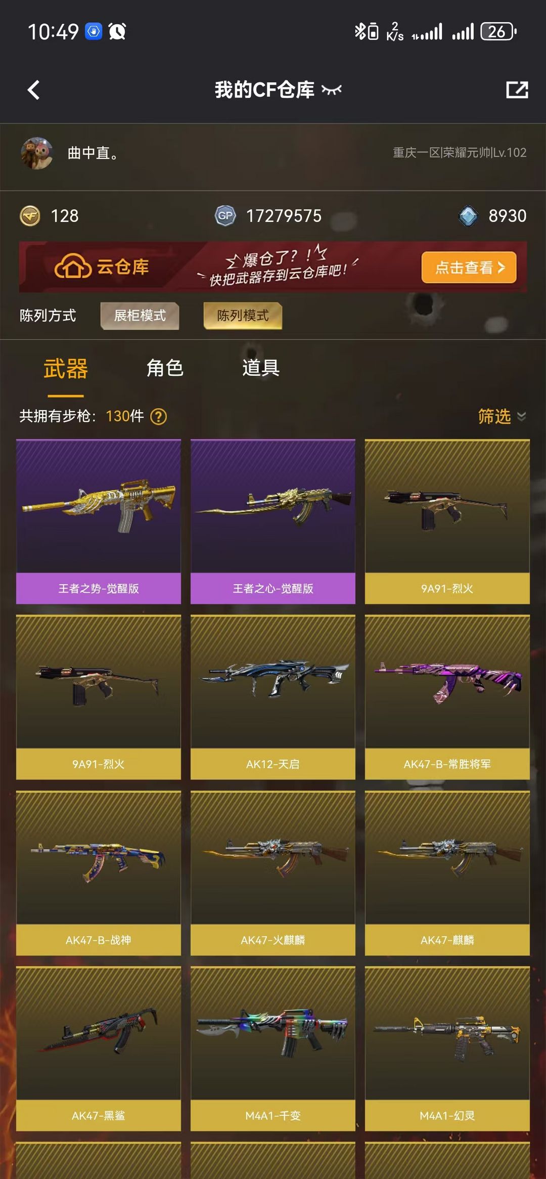 装备描述:王者武器:王者之势-觉醒版;王者之魂-觉醒版;王者之心-觉醒版 英雄武器:Barrett-毁灭;机械迷城-穹宇;M4A1-千变;烟雾弹-云龙;高爆手雷-云龙;M4A1-黑骑士;黑武士-锦绣游龙;天神-动感闪耀;屠龙-动感闪耀;手雷-动感闪耀;无影-神兵利器;麒麟刺;AK47-火麒麟;Kar98K-星神;M4A1-雷神;白虎-电玩蓝兔;AK47-B-战神;Barrett-毁灭;M4A1-黑龙;Scar Light-白虎;高爆手雷-幻灵;烟雾弹-幻灵;闪光弹-幻灵;幻灵之锋;COP 357-幻灵;M4A1-幻灵;M200-幻神;Barrett-朱雀;Barrett-暗月传说;AK47-B-常胜将军