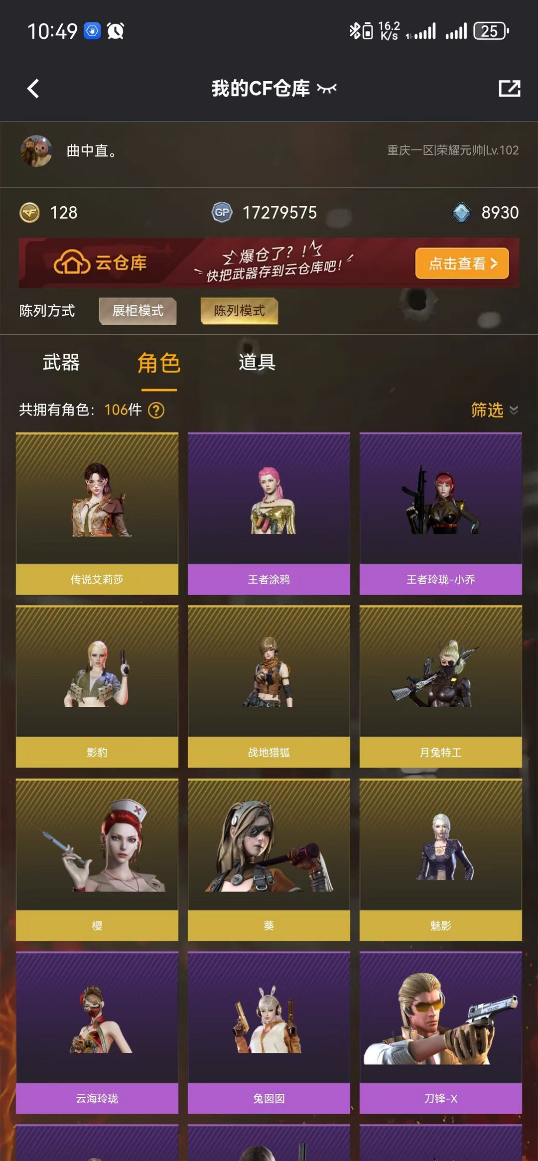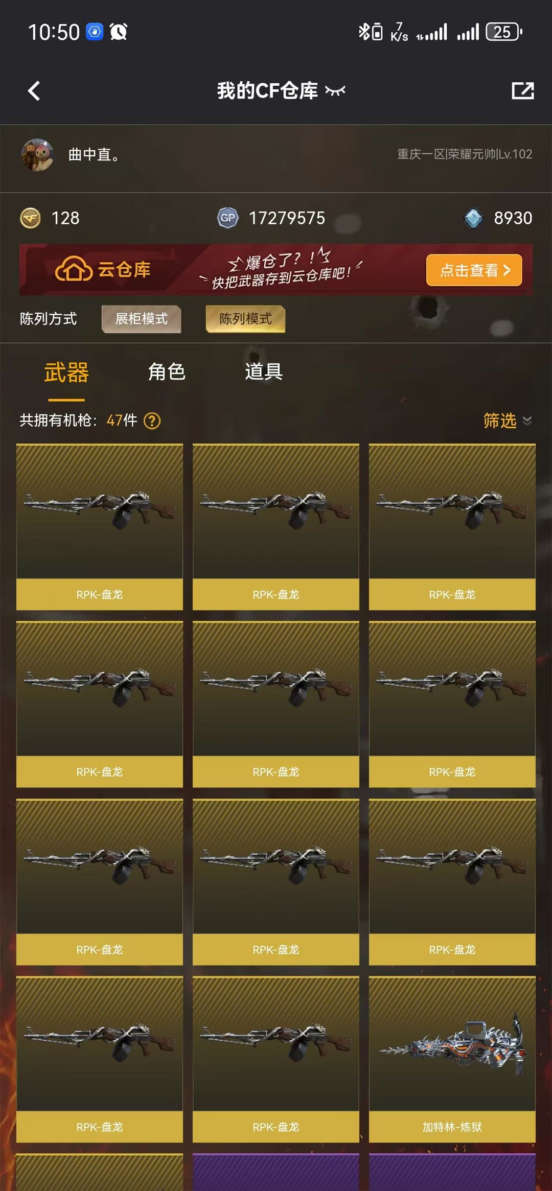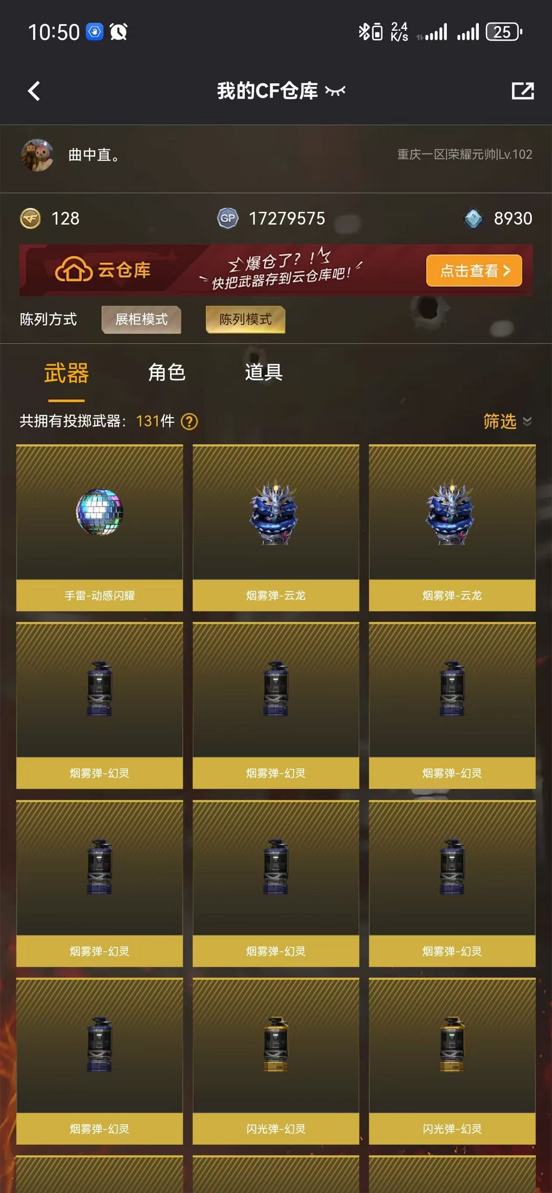 装备描述:王者武器:王者之势-觉醒版;王者之魂-觉醒版;王者之心-觉醒版 英雄武器:Barrett-毁灭;机械迷城-穹宇;M4A1-千变;烟雾弹-云龙;高爆手雷-云龙;M4A1-黑骑士;黑武士-锦绣游龙;天神-动感闪耀;屠龙-动感闪耀;手雷-动感闪耀;无影-神兵利器;麒麟刺;AK47-火麒麟;Kar98K-星神;M4A1-雷神;白虎-电玩蓝兔;AK47-B-战神;Barrett-毁灭;M4A1-黑龙;Scar Light-白虎;高爆手雷-幻灵;烟雾弹-幻灵;闪光弹-幻灵;幻灵之锋;COP 357-幻灵;M4A1-幻灵;M200-幻神;Barrett-朱雀;Barrett-暗月传说;AK47-B-常胜将军