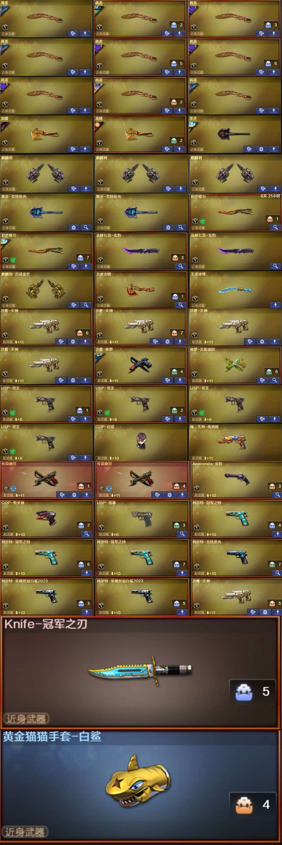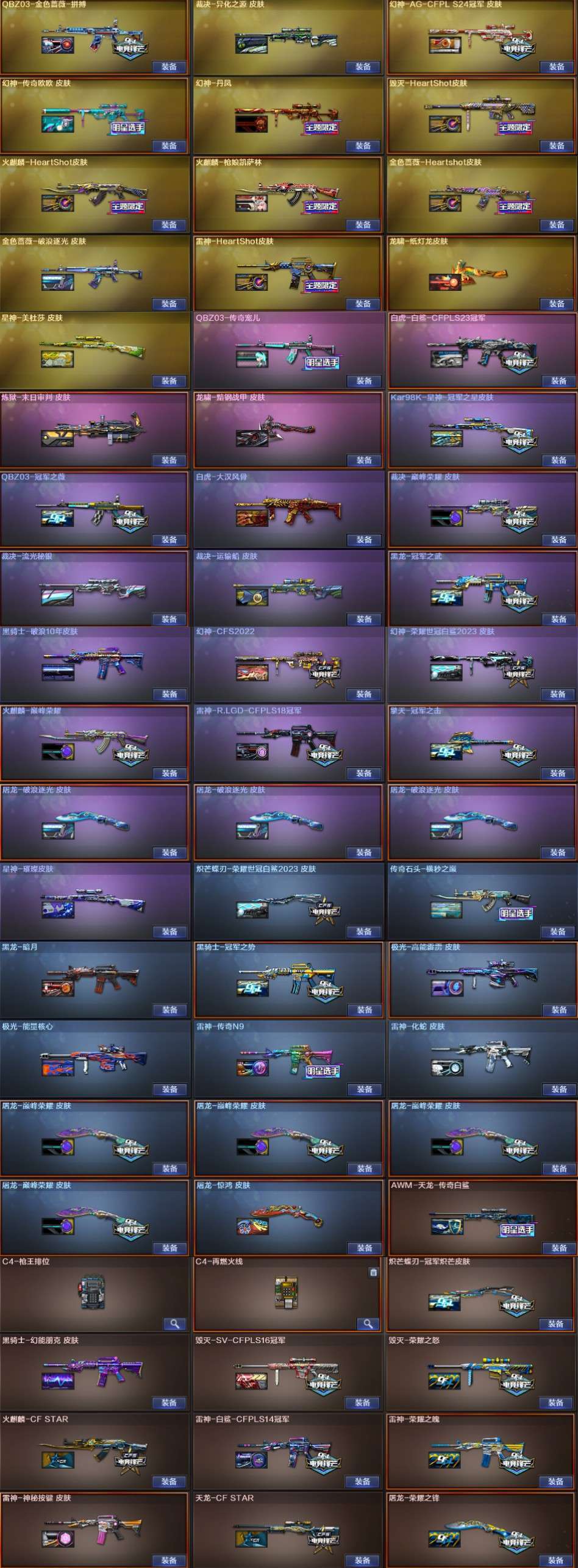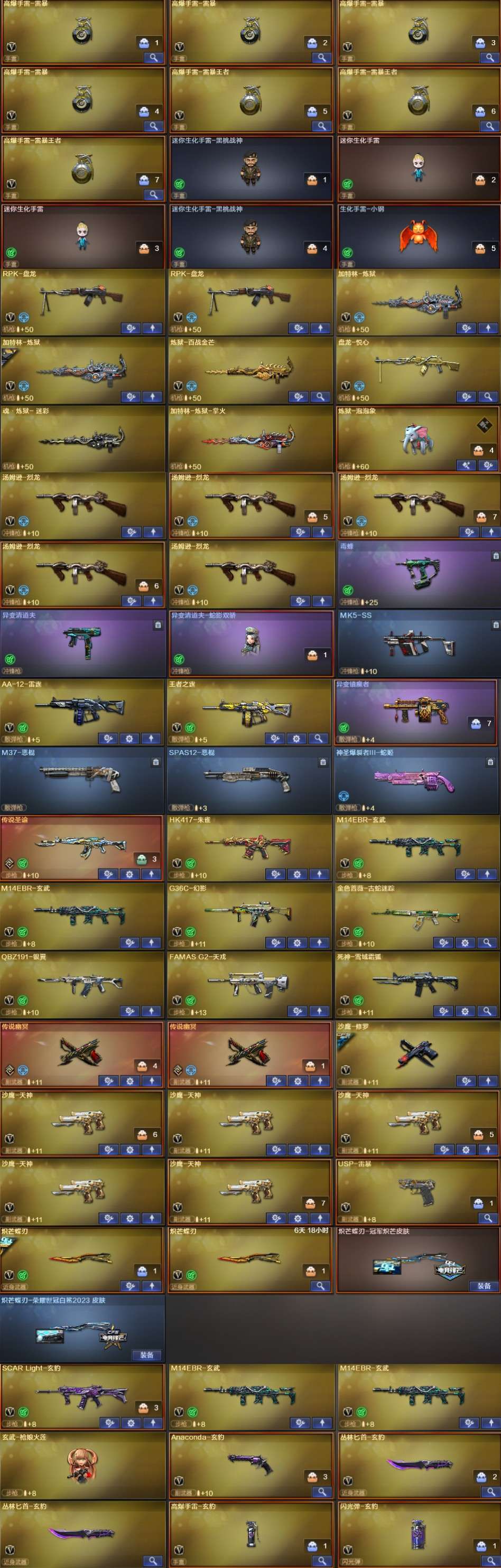 装备描述:超核账号,出问题必究,请高抬贵手! 爆破生化号,爆破:传说幽瞳幽冥圣域星骇,传奇欧欧幻神ag白鲨5皮无垃圾皮+音效卡,满步枪满狙新枪天戎,银翼,g36c等,除朱雀无音效卡,其他音效卡全部都有,都是质量皮三件套,冠军之星,白鲨白虎,冠军之微,荣耀之魄等。手枪10几把,4冥王,3冠特,1雷暴1cop,2白鲨柯尔特,1竞技柯尔特等。近战4把巅峰屠龙,9把屠龙,1蝴蝶刀,1怨种之刃,黄金鲨臂,王者炎啸王者冰峰。手雷7雷暴和王者雷暴,闪光6雷暴1雷霆,烟雾弹4白鲨8玄豹,角色:四防星骇,四防隼、荆棘,鹰,王者鹰,云悠悠,王者云悠悠等10几个角色 生化:泡泡象3三炼狱+末日+音效卡3盘龙,毒蜂清道夫和蛇影双娇+5烈,四防隼和荆棘,一把蝴蝶刀冠军双皮,黄金鲨臂,金蚀,全套玄豹,双幽冥,圣域,天戎