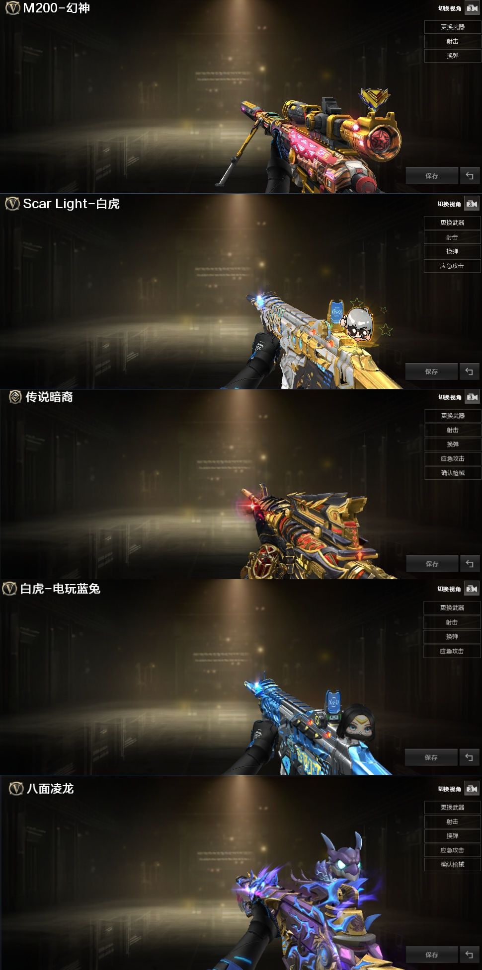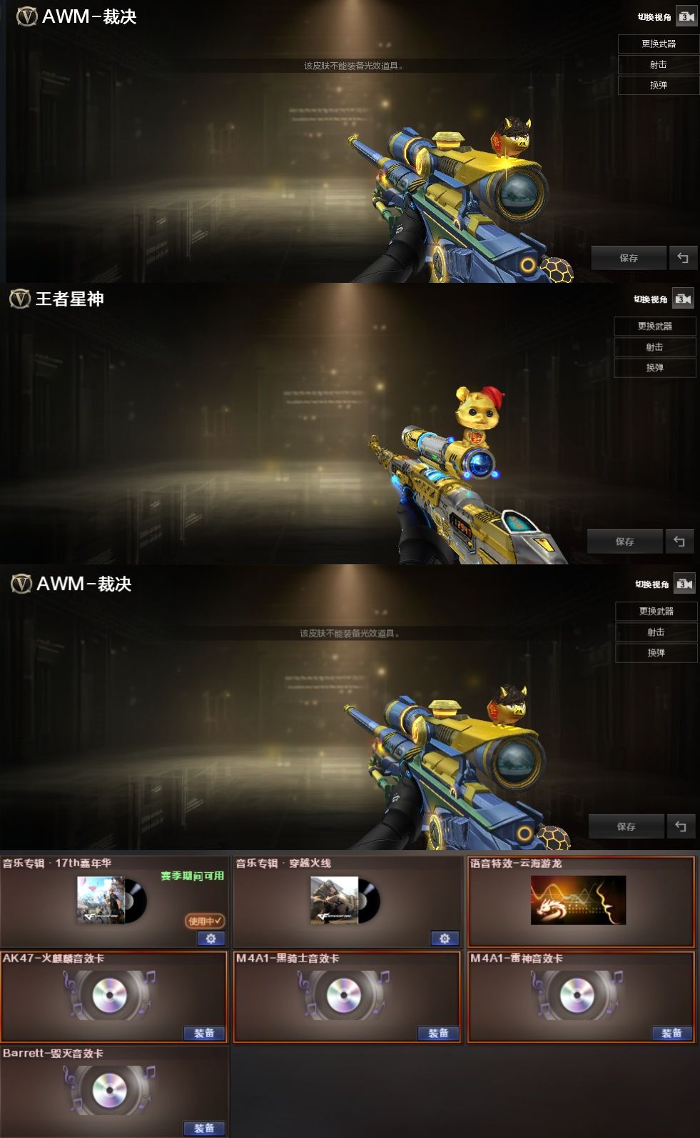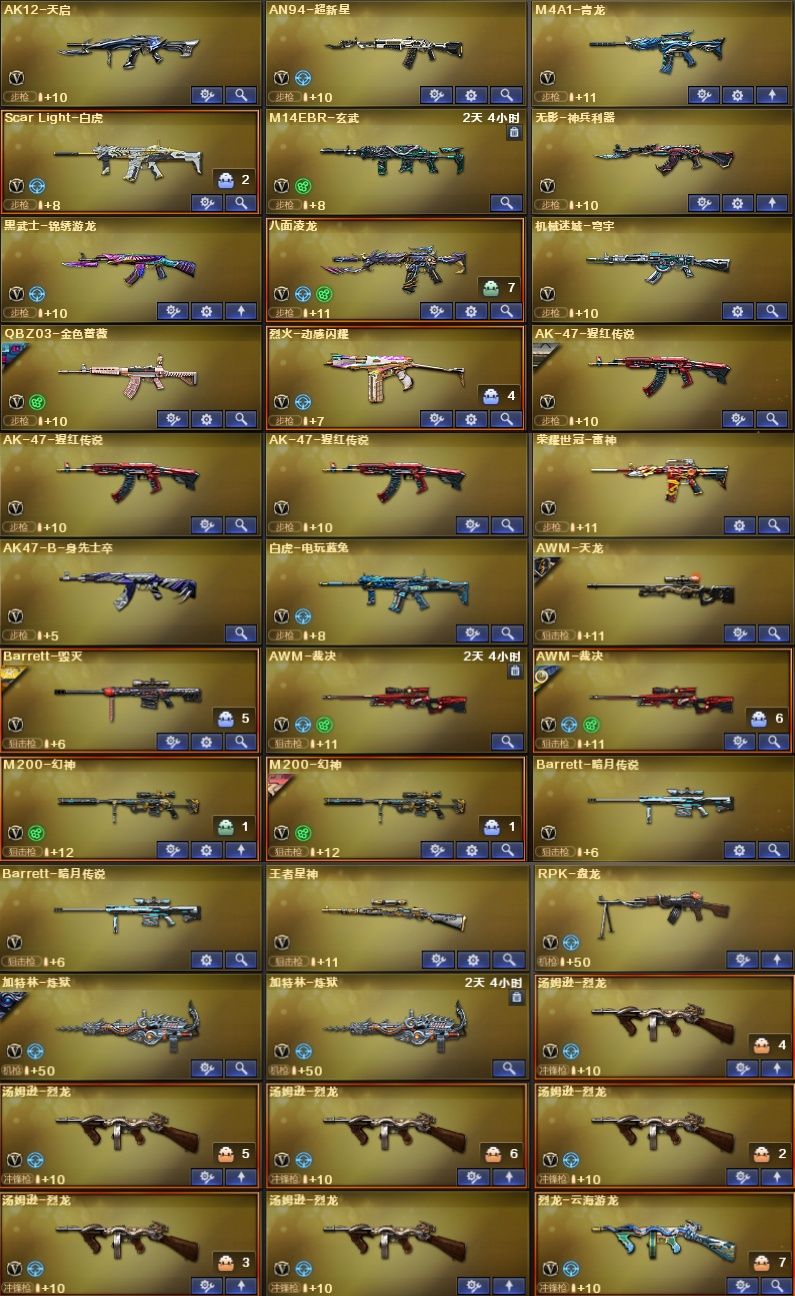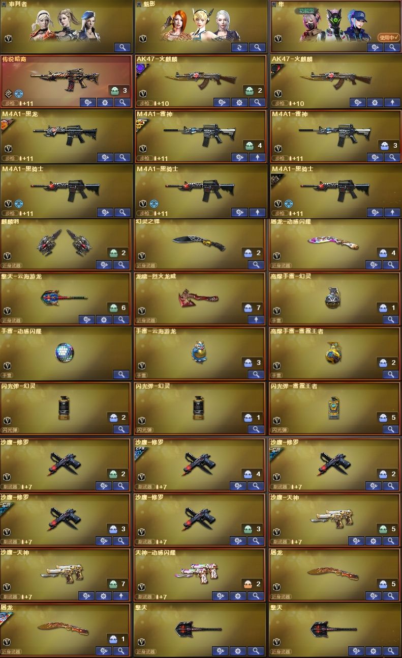 装备描述:王者武器:M4A1-雷霆王者;高爆手雷-雷霆王者;闪光弹-雷霆王者-觉醒版;烟雾弹-雷霆王者-觉醒版;Barrett-雷霆王者;王者星神-觉醒版;炫金火麒麟;炫金天龙 英雄武器:加特林-炼狱;M14EBR-玄武;AWM-裁决;机械迷城-穹宇;八面凌龙;黑武士-锦绣游龙;Barrett-云海玲珑;擎天-云海游龙;烈龙-云海游龙;手雷-云海游龙;M200-幻神;M4A1-青龙;龙啸-烈火龙威;手雷-动感闪耀;烈火-动感闪耀;天神-动感闪耀;屠龙-动感闪耀;无影-神兵利器;AK47-火麒麟;Barrett-暗月传说;白虎-电玩蓝兔;M4A1-黑骑士;传说暗裔;Scar Light-白虎;AK-47-猩红传说;荣耀世冠-雷神;汤姆逊-烈龙;QBZ03-金色蔷薇;沙鹰-天神;闪光弹-幻灵;幻灵之锋;高爆手雷-幻灵;烟雾弹-幻灵;AK47-B-身先士卒;M4A1-雷神;沙鹰-修罗;AWM-裁决;麒麟刺;RPK-盘龙;加特林-炼狱;AK12-天启;AN94-超新星;AWM-天龙;屠龙;擎天;Barrett-毁灭;M4A1-黑龙 角色:审判者;魅影;隼;猎狐者;飞虎队;刀锋;潘多拉;幻影;雷霆-β;复
