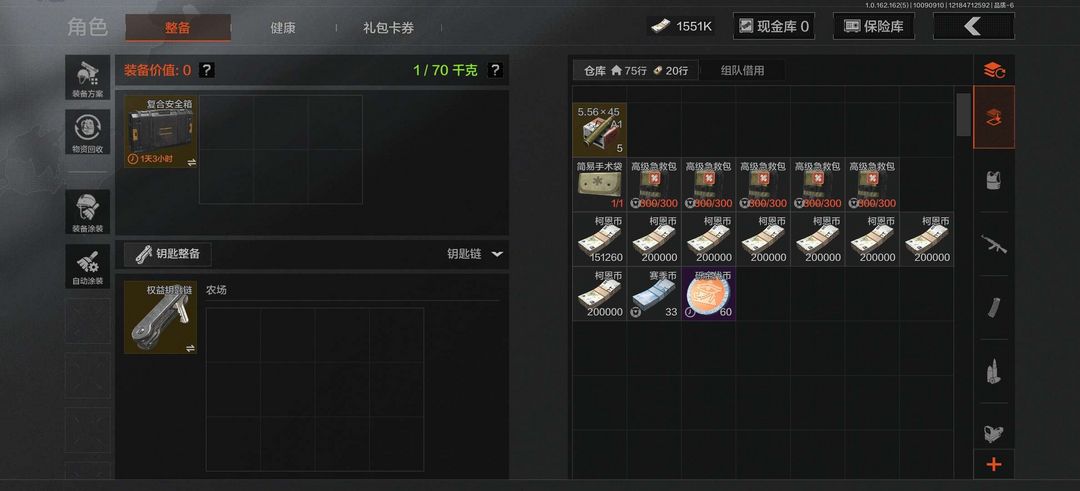 暗区突围柯恩币1551K,仓库价值1.5M,有六格保险,万币号,护航首选,欢迎老板上号体验!
