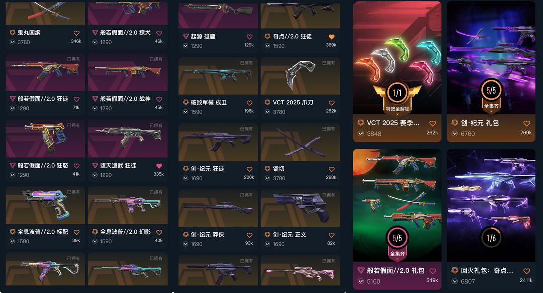 可排☆vct爪刀☆创纪元☆镭切套装☆般若太刀☆全息波普☆堕天遗武☆破败戍卫☆起源雄鹿☆千灵莲花冥狙☆