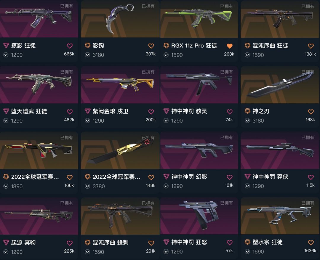 可排丨影钩掠夺爪刀丨22冠军套丨神中神罚套装丨弃王塑水宗混沌显卡狂徒丨起源冥狙丨混沌蜂刺丨紫金戍卫