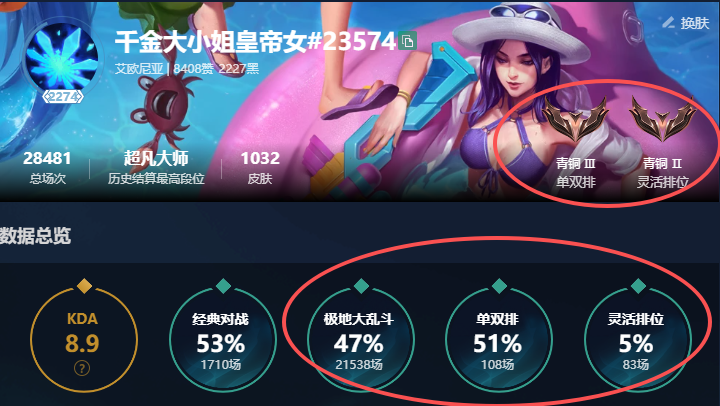 艾欧尼亚⭐1802皮⭐单双黑铁⭐灵活青铜⭐大乱斗2万场46%胜率