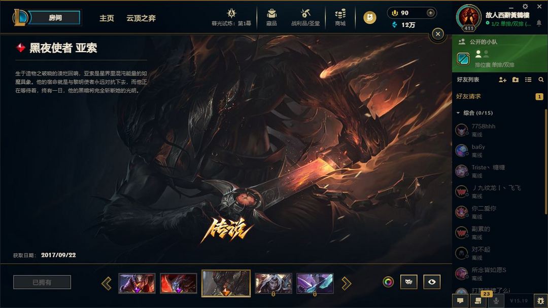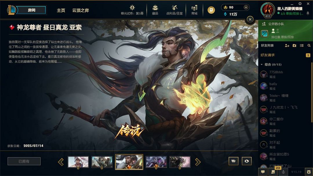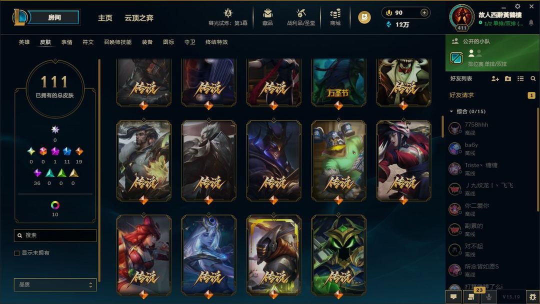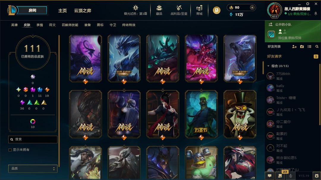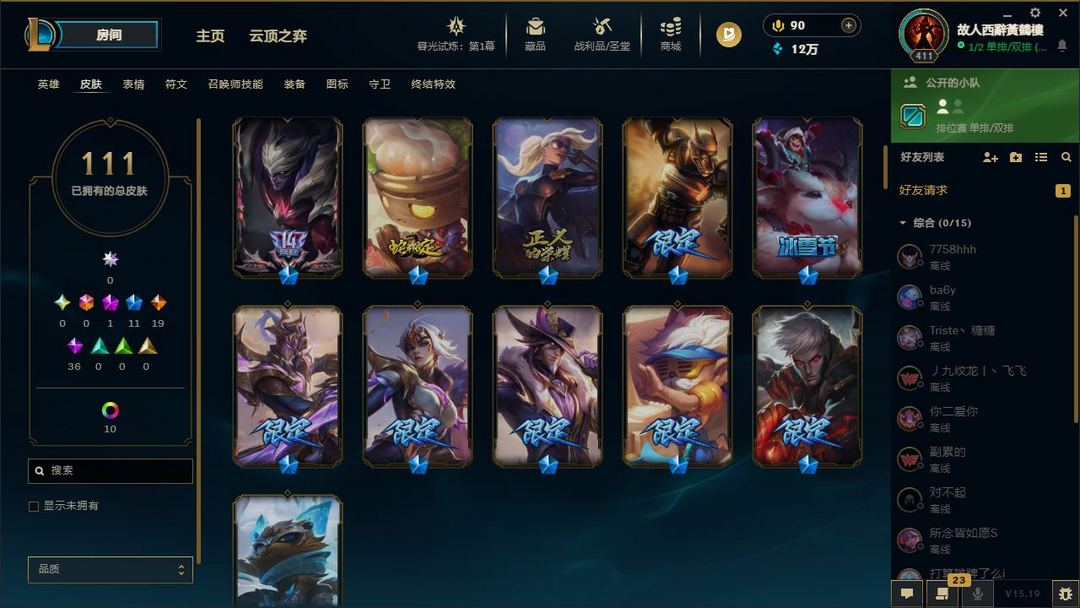 全英雄,111皮,段位铂金三,亚索全皮 黑夜使者 昼日真龙。神王诺手。天煞劫。冠军 排位 冰雪节限定