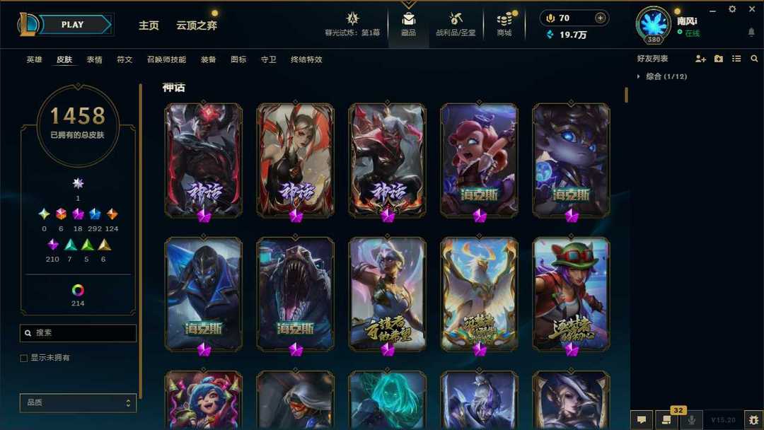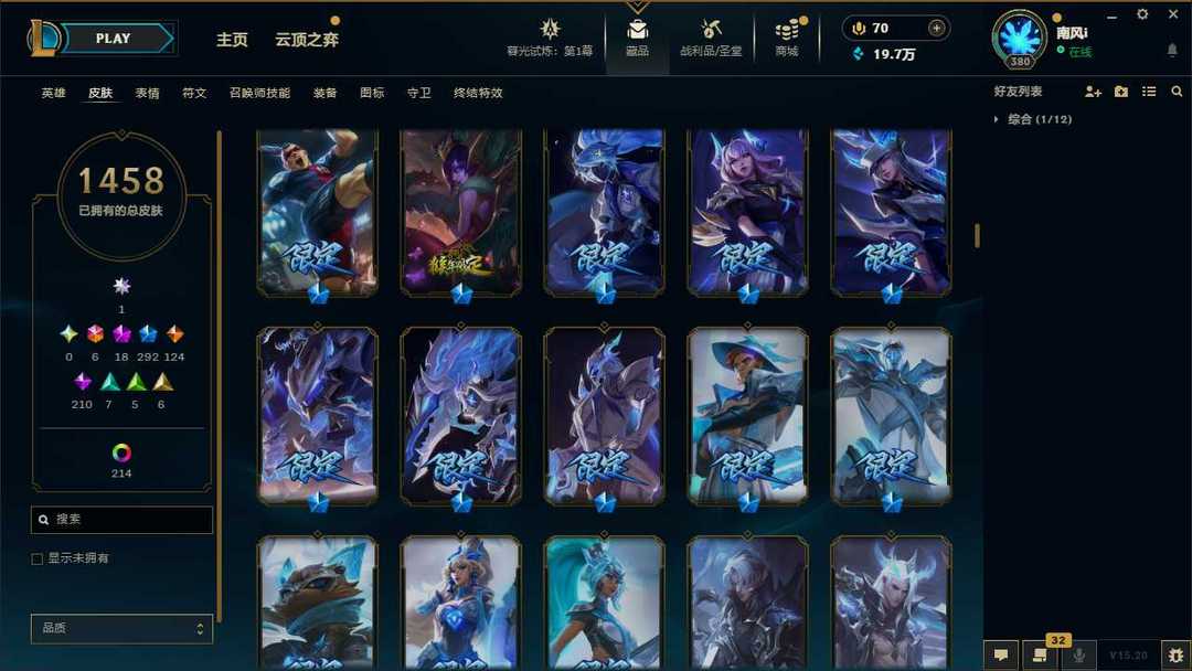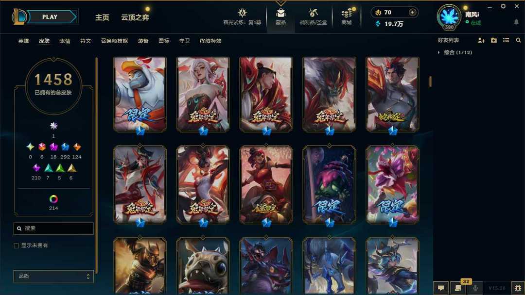 【小天】1700皮新皮肤多♥1458原皮大师♥214炫彩♥6终极♥18神话♥292限定