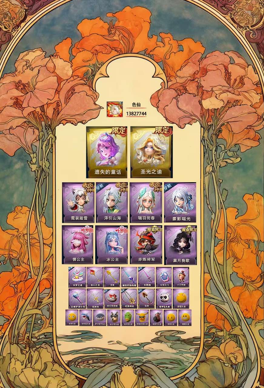装备描述:小黄耀世遗失的童话,薇薇安耀世圣光之谕,s2魔盒赤练将军,s3魔盒黑月挽歌,情公主,冰公主,零泽引山海