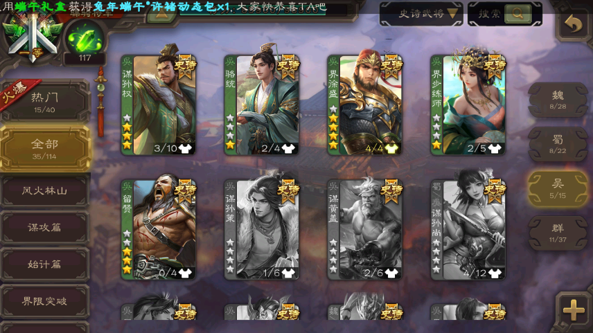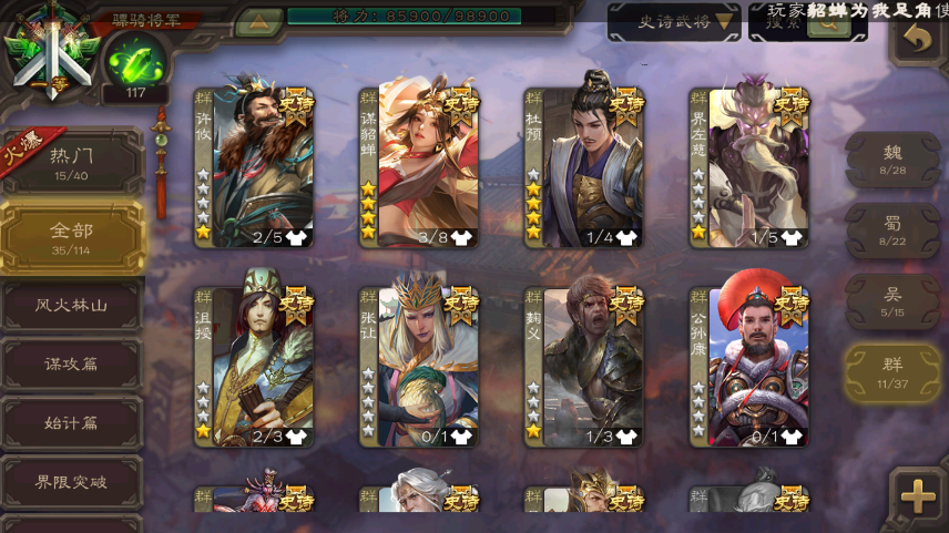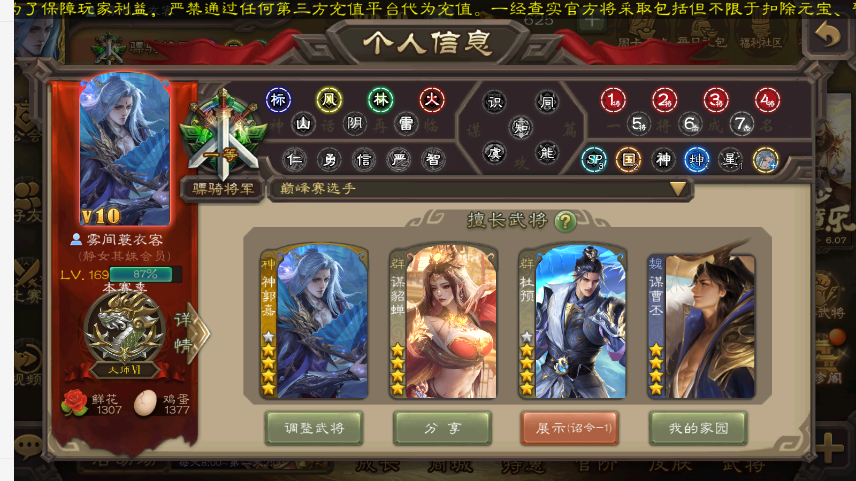 限制: 撤单率<80%才可租用此帐号装备描述:动戏志才-郝昭-王凌-王元姬-羊徽瑜-马云禄-动张星彩-祢衡-南华老仙-卑弥呼-神赵云-神张辽